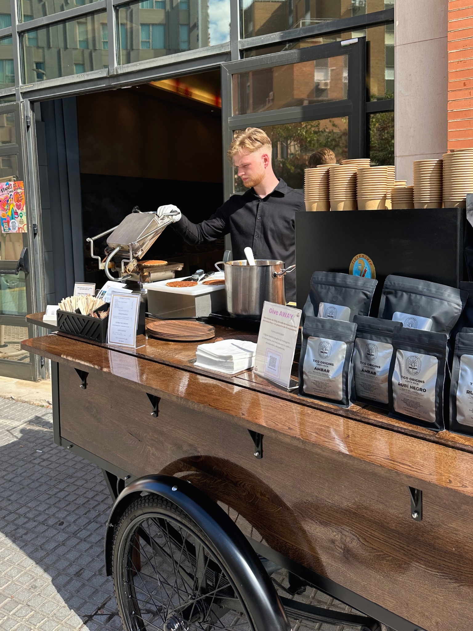 En Tico Origins creamos un concepto único: Café de especialidad de Costa Rica y Stroopwafels holandeses horneados en vivo — crujientes, rellenos de caramelo e irresistibles. Con nuestra Coffee Bike, llevamos elegancia, calidad y entretenimiento, elevando tu evento o espacio a una experiencia premium.